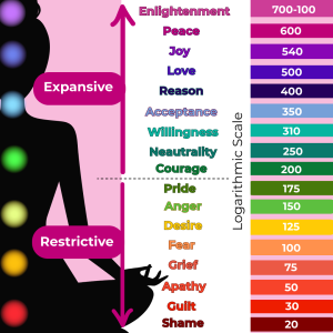 The lower half represents emotional states with low frequency output linked to restrictive behaviours. Once you reach courage, emotions become more expansive and higher in frequency. Comparing the frequency number of joy and shame shows emotions fluctuate hugely, influencing us and our environment. Experiencing lower emotions is natural, but if not addressed constructively, they can remain stuck in our psyche forming barriers to love and the higher frequencies.
